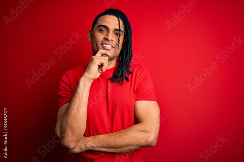 Young handsome african american afro man with dreadlocks wearing red casual t-shirt looking confident at the camera smiling with crossed arms and hand raised on chin. Thinking positive.