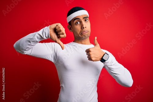 Young handsome african american sportsman wearing sportswear over red background Doing thumbs up and down, disagreement and agreement expression. Crazy conflict
