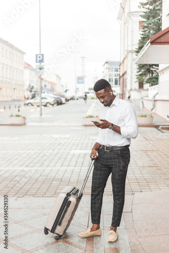 Young handsome black man with luggage using smartphone and listening music with earphones in the city