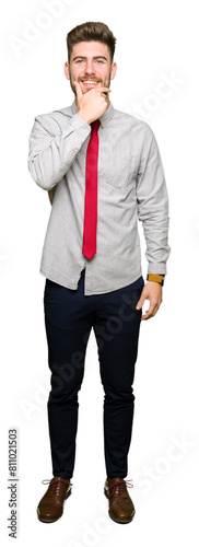 Young handsome business man looking confident at the camera with smile with crossed arms and hand raised on chin. Thinking positive.