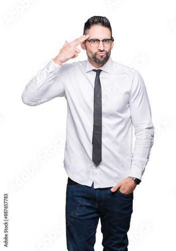 Young handsome business man wearing glasses over isolated background Shooting and killing oneself pointing hand and fingers to head, suicide gesture.
