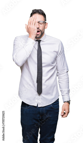 Young handsome business man wearing glasses over isolated background Yawning tired covering half face, eye and mouth with hand. Face hurts in pain.