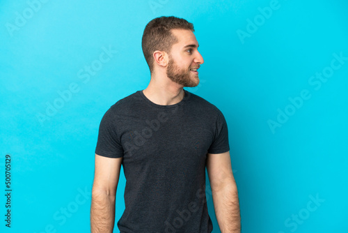 adult, background, beard, blond, blue, caucasian, colours, colourful, expression, face, fun, funny, gesture, good, guy, happiness, happy, isolated, laugh, laughing, male, man, model, people, person, portrait, positive, side, smile, smiling, studio, wall, young, looking, man