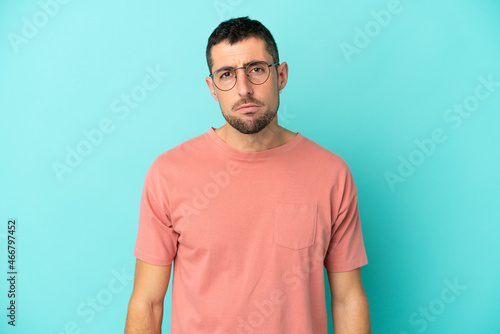 Young handsome caucasian man isolated on blue background With glasses