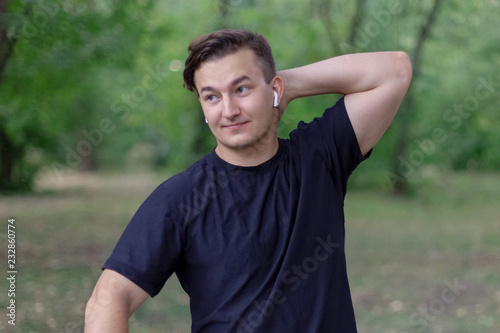 Young handsome caucasian man puts a hand on the neck, complicated expression on the face, smiling. Outdoors, green park background, copy space, close up. Casual wear, white earphones, trendy.