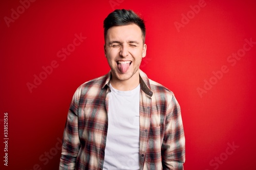 Young handsome caucasian man wearing casual modern shirt over red isolated background sticking tongue out happy with funny expression. Emotion concept.