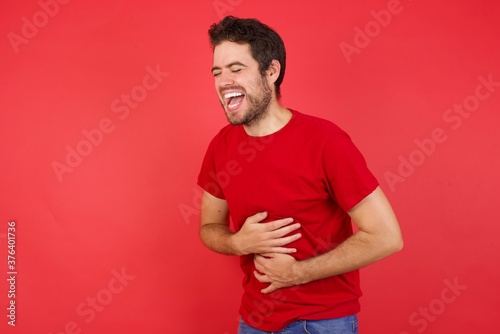 Young handsome caucasian man wearing t-shirt over isolated red background smiling and laughing hard out loud because funny crazy joke with hands on body.