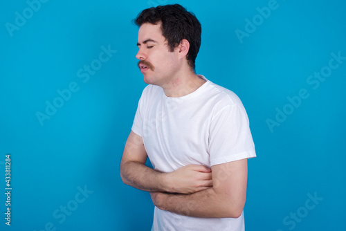 young handsome Caucasian man with moustache wearing white t-shirt against white background with sad expression covering face with hands while crying. Depression concept.