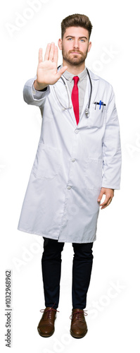 Young handsome doctor man wearing medical coat doing stop sing with palm of the hand. Warning expression with negative and serious gesture on the face.