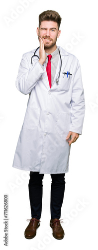 Young handsome doctor man wearing medical coat touching mouth with hand with painful expression because of toothache or dental illness on teeth. Dentist concept.