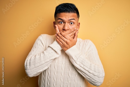Young handsome latin man wearing white casual sweater over yellow background shocked covering mouth with hands for mistake. Secret concept.