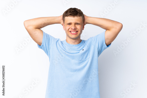 Young handsome man over isolated white background frustrated and takes hands on head