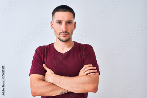 Young handsome man standing over isolated background skeptic and nervous, disapproving expression on face with crossed arms. Negative person.