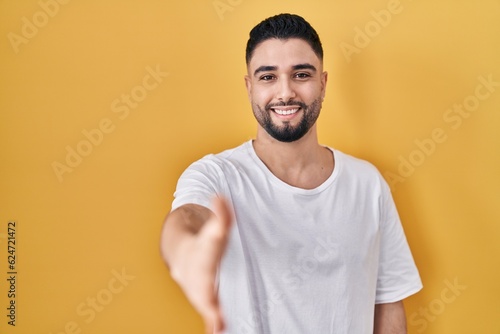 Young handsome man wearing casual t shirt over yellow background smiling friendly offering handshake as greeting and welcoming. successful business.