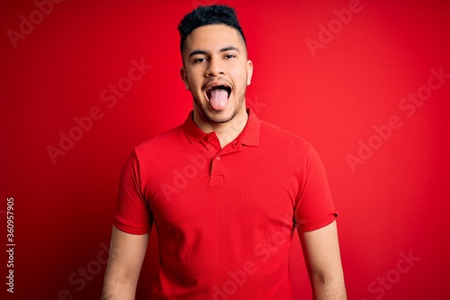 Young handsome man wearing red casual polo standing over isolated background sticking tongue out happy with funny expression. Emotion concept.