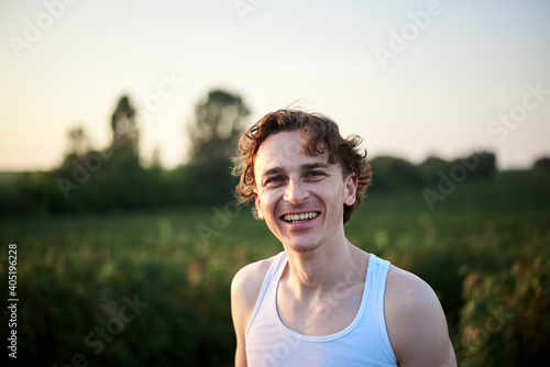 Young handsome man, wearing white t-shirt, smiling, laughing in front of green field. Human emotions concept. Happiness. Close-up male portrait outside on natural background.