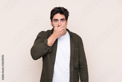 man, man, people, person, male, guy, studio, photogenic, young, adult, hispanic, caucasian, beard, isolated, background, wall, cover, close, covering, expression, gesture, hand, mouth, secret, worried, surprise, shy, silence, shock, mistake, emotion, scared