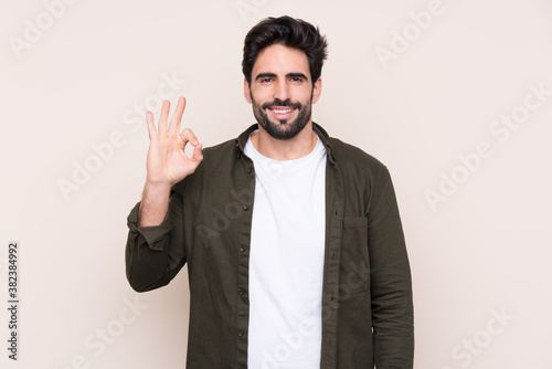 Young handsome man with beard over isolated background surprised and showing ok sign