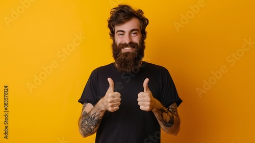 casual attire, young, racked, ok, adult, gesticulate, male, hispanic, cool, isolated, model, positive, beard, attractive, finger, man, approving, thumb, symbol, photogenic, fashion, wall, guy, yellow, successful, gesture, person, studio, style, up, smile, portrait, expression, latin, people, happy, good, background, caucasian, proud