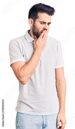 Young handsome man with beard wearing casual polo bored yawning tired covering mouth with hand. restless and sleepiness.