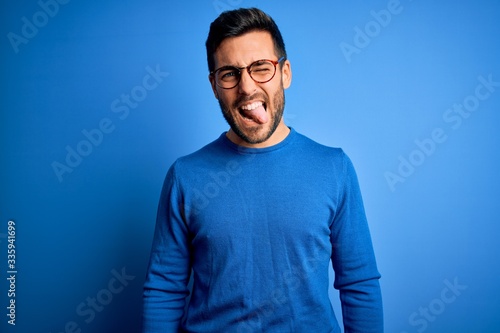 Young handsome man with beard wearing casual sweater and glasses over blue background sticking tongue out happy with funny expression. Emotion concept.