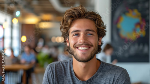 young handsome man with blue eyes on the background of a modern IT office, worker, programmer, professional, designer, guy, boy, portrait, smile, space for text, coworking, open space, people, person