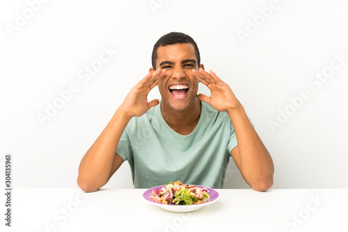 salad, food, healthy, fresh, green, lettuce, meal, vegetarian, nourishment, vegetable, leaf, diet, plate, epicure, man, man, people, person, male, young, adult, american, brunette, sitting, african, mixed, emotion, mouth, yell, talking, scream, expression, concept, sound, shout, shouting, loud, message, voice, talk, communication