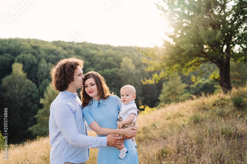 Young happy caucasian couple with little baby boy. Parents and son walking and having fun together. Mother and father playing with toddler outdoors. Family, parenthood, childhood, happiness concept.
