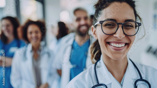 Young happy female doctor standing in medical hospital background. Woman physician therapist or obstetrician wearing uniform looking at camera in clinic. Healthcare medicine concept. Portrait.