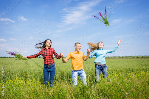 male, girl, woman, female, man, girlfriend, people, boyfriend, run, meadow, jump, young, grass, summer, love, friendship, outdoors, sky, fun, enjoying, hand, three, flower, happiness, field, wheat, teamwork, active, casual attire, freedom, bloom, smiling, team, recreation, funny, energy, youth, human relationships, together, laugh, playful, joy, cheerful, nature, action, happy