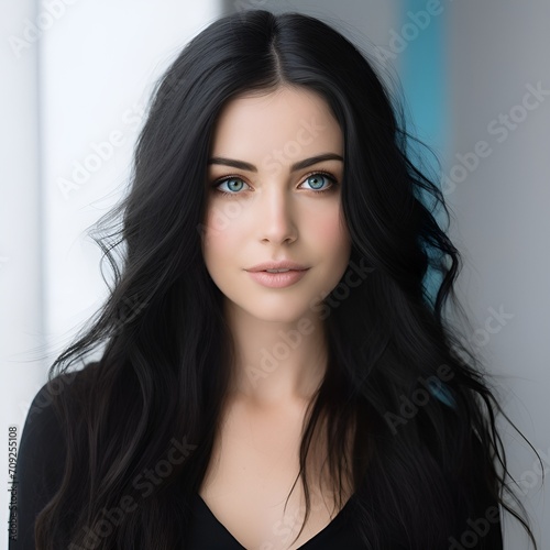 young happy long black haired woman posing and looking in camera,white background