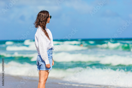 Young happy woman on the beach enjoy her summer vacation