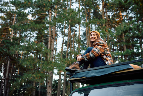 Young happy woman sitting on camper trailer's roof in nature.