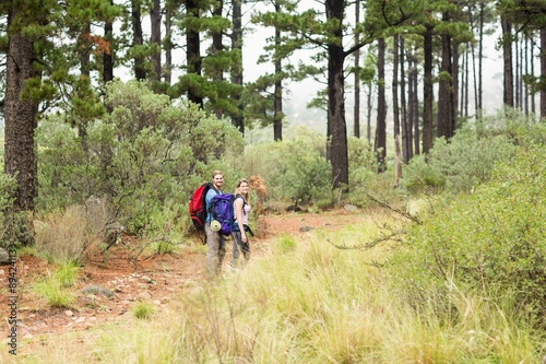 young adult, woman, female, caucasian, man, male, recreational pursuit, adventure, adventurer, hiking, hike, orienteering, fit, healthy, athletic, countryside, forest, nature, environment, trail, scenic, activity, recreation, leisure, lifestyle, exploration, green, happy, smiling, cheerful, photogenic, pretty, couple, human relationships, together, equipment, backpack, backpack, portrait, outdoors