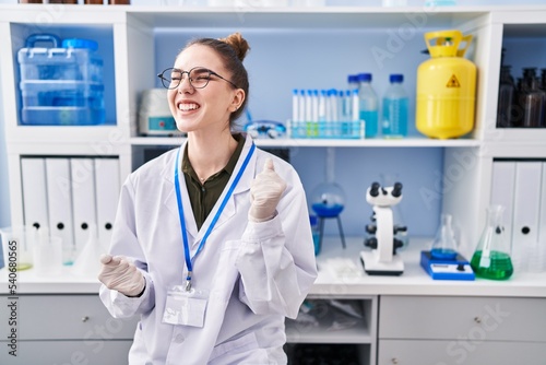 Young hispanic girl working at scientist laboratory celebrating surprised and amazed for success with arms raised and eyes closed