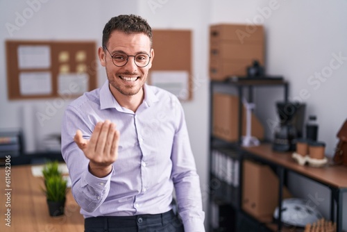 Young hispanic man at the office beckoning come here gesture with hand inviting welcoming happy and smiling