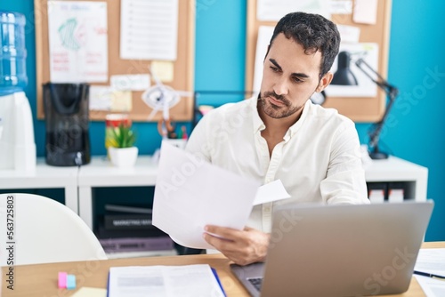 young, hispanic, man, male, guy, adult, person, portrait, photogenic, beard, business, professional, work, men at work, working, success, manager, boss, employee, elegant, job, table, desk, executive, computer, laptop, cyberspace, online, sitting, document, paperwork, paper, read, reading, serious, condensed, relaxed, looking, concentration, office, workplace, indoor, indoor, interior, room, background