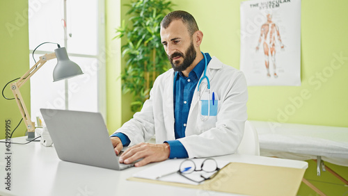young, hispanic, man, male, guy, adult, person, portrait, photogenic, beard, doctor, health care, medicals, medicine, work, working, professional, stethoscope, uniform, table, desk, surgeon, diagnosis, visit, consultation, sitting, cyberspace, online, laptop, computer, device, technology, serious, focused, concentrated, clinic, center, hospital, room, workplace, indoor, indoor, interior, background