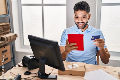 Young hispanic man ecommerce business worker using touchpad and credit card at office