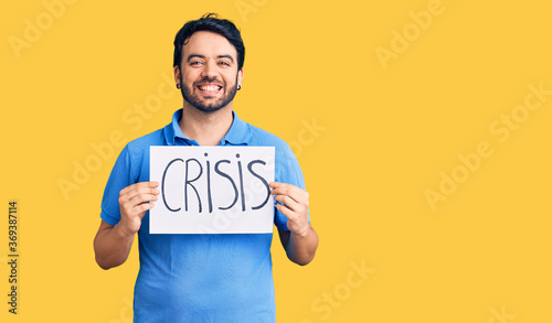 Young hispanic man holding crisis message paper looking positive and happy standing and smiling with a confident smile showing teeth