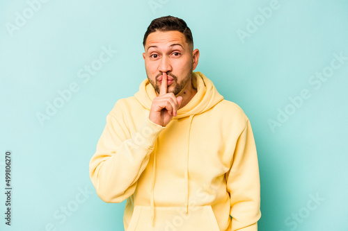 Young hispanic man isolated on blue background keeping a secret or asking for silence.