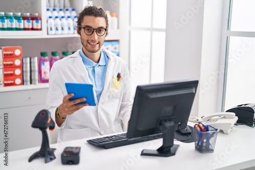 Young hispanic man pharmacist using touchpad and computer, working at pharmacy