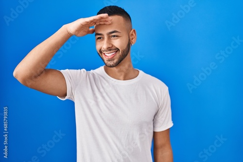Young hispanic man standing over blue background very happy and smiling looking far away with hand over head. searching concept.