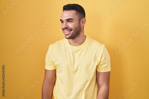Young hispanic man standing over yellow background looking away to side with smile on face, natural expression. laughing confident.