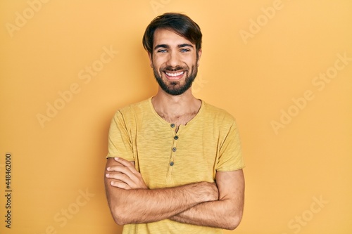 Young hispanic man wearing casual clothes happy face smiling with crossed arms looking at the camera. positive person.