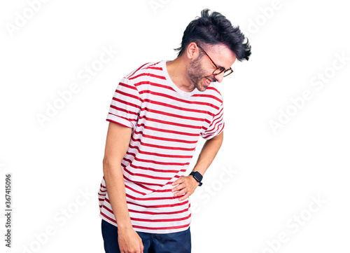 Young hispanic man wearing casual clothes suffering of backache, touching back with hand, muscular pain