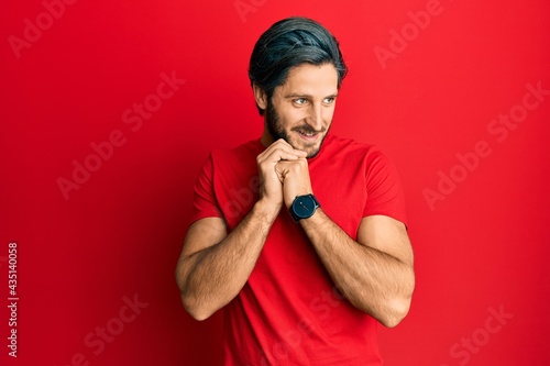 Young hispanic man wearing casual red t shirt laughing nervous and excited with hands on chin looking to the side