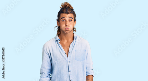 Young hispanic man wearing summer style puffing cheeks with funny face. mouth inflated with air, crazy expression.