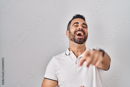 Young hispanic man with beard wearing casual clothes over white background laughing at you, pointing finger to the camera with hand over body, shame expression