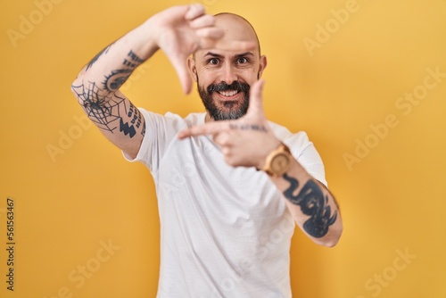 Young hispanic man with tattoos standing over yellow background smiling making frame with hands and fingers with happy face. creativity and photography concept.